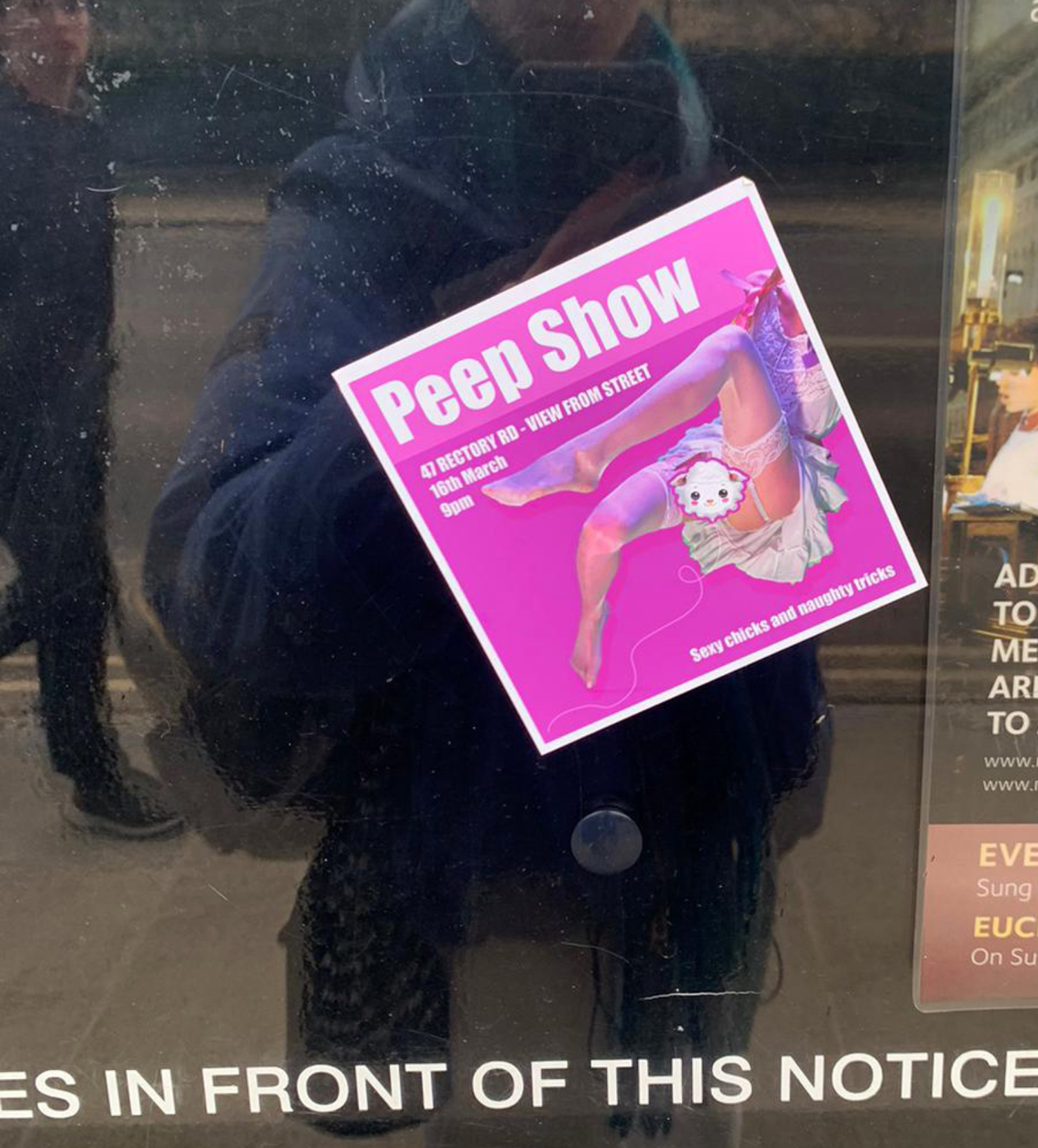 Stickers advertising a Peep Show were distributed across the centre of Oxford.